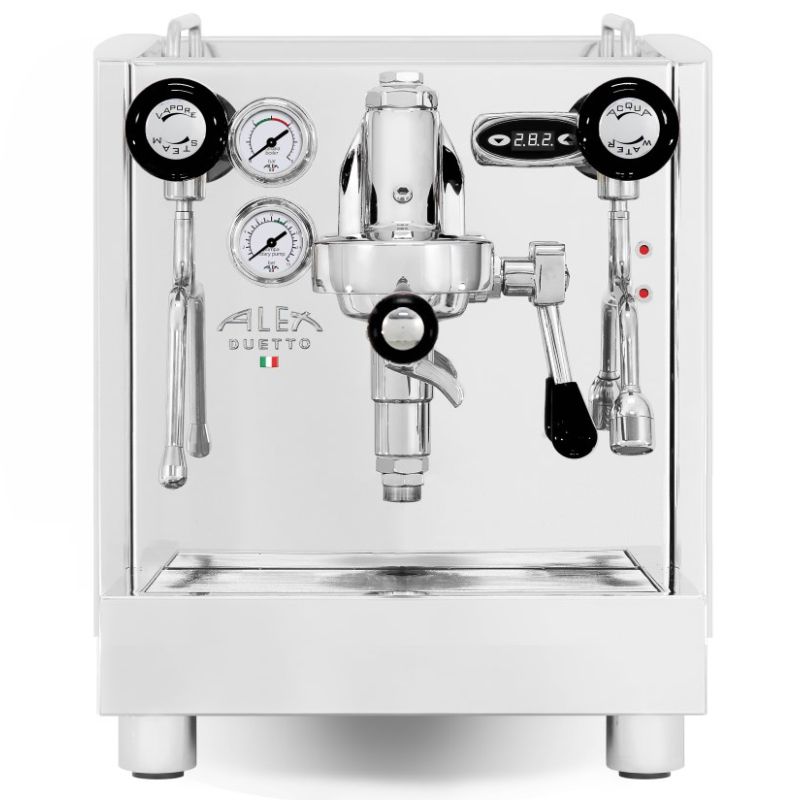 Izzo introduceert de 4e versie van de Alex Duetto Plus MK618 met RVS binnenwerk voor een perfecte smaak. Het verschil tussen MK618 en de MK617 zit hem in het boiler en leiding materiaal. Voor de MK617 wordt koper in plaats van RVS gebruikt. Het voordeel van RVS is dat dit zeer smaak neutraal is. De mensen van Izzo streven duidelijk perfectie na! De fraaie vormgegeven behuizing is volledig uitgevoerd in zeer hoogwaardig RVS met een mooie diepe glans. Aan de afwerking van alle plaatdelen is duidelijk te zien dat alleen het mooiste goed genoeg was. Fraaie retro vormgegevens kranen voor stoom en heetwater sieren samen met de welbekende E61 zetgroep de voorzijde van deze prachtige Izzo Alex Duetto IV Plus. Op het front van de machine zijn fraaie drukmeters en een PID controller geplaatst.- Volledige omschrijving